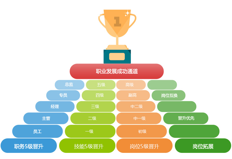 在人力開(kāi)發(fā)體系的基礎(chǔ)上,集團(tuán)為保證員工持續(xù)的競(jìng)爭(zhēng)力、適應(yīng)性,以及不斷的發(fā)展動(dòng)力,特開(kāi)發(fā)了“根源特色”的四條發(fā)展通道。在傳統(tǒng)的“技術(shù)和管理”兩個(gè)發(fā)展維度的基礎(chǔ)上,增設(shè)了“崗位五級(jí)上升通道”及“崗位拓展/輪換上升通道”。集團(tuán)的每個(gè)員工都可以根據(jù)自己的發(fā)展訴求以及自身特點(diǎn),選擇發(fā)展通道?!巴ǖ纼?nèi)部可以上升,之間可以互通”,讓每個(gè)員工都能在根源得到職業(yè)的發(fā)展,實(shí)現(xiàn)職業(yè)的成功。